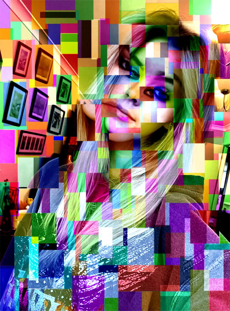 This is my second Adobe Photoshop self portrait. This portrait idea was inspired by Adrian Brannan’s work who creates photo collage images which I find really intriguing (Figure 2). Initially, I started off enlarging certain segments of the face and taking sections from another image of me and layering them on top in different cut out shapes. This created a sense of perspective. To create all the dimensional square and rectangle segments, I experimented with different methods including colour balance, hue/saturation, and brightness/contrast. I created these in all different shapes and sizes which creates variation. This creates a multidimensional effect which adds to the sense of perspective and creates a busy composition which looks very intricate. The different areas show variating examples of tone, light, and depth. This also captures different tones and creates a celebration of colour. I believe this conveys my lively, bright, and chaotic side of my personality. Its unrealistic and abstract appearance is extremely eye-catching and has created a unique, detailed, and alluring piece.