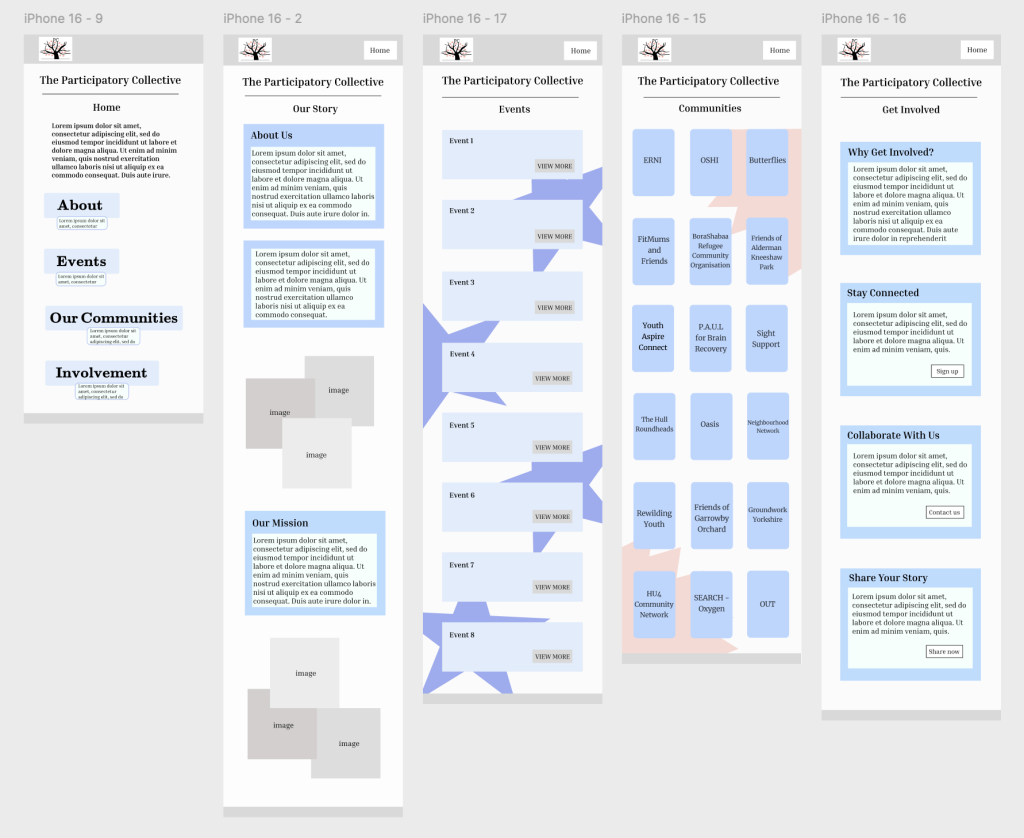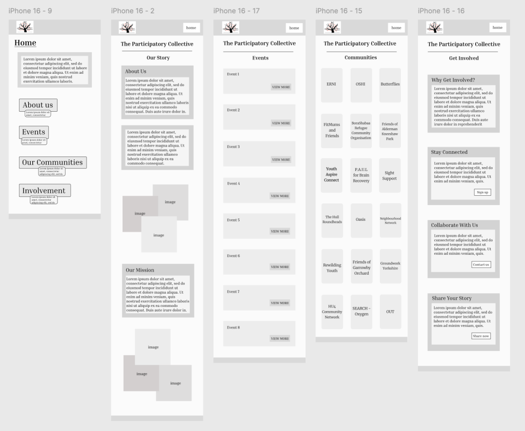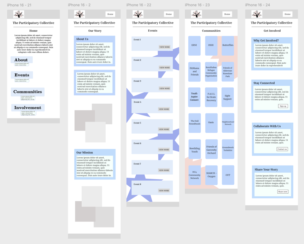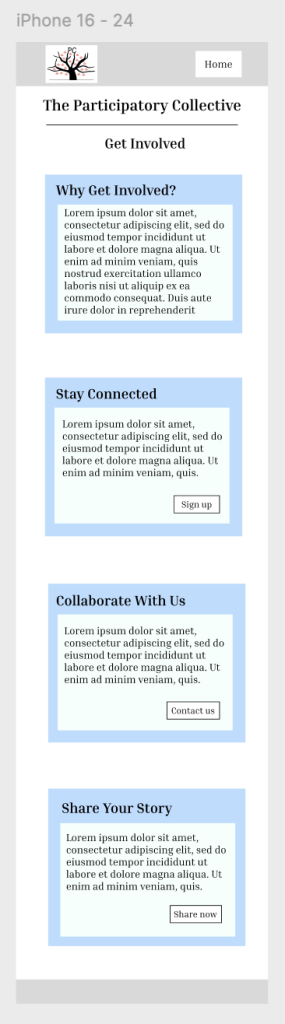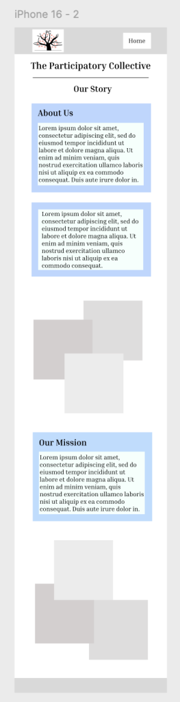 In developing my mid-fidelity prototype, I began shaping a visual direction that feels approachable, calm, and community-focused. Even though mid-fidelity doesn’t focus on final colours and detailed elements, I started defining a visual structure that supports clarity and warmth. I focused on clean spacing, consistent alignment, and simple shapes so that users can scan content without feeling overwhelmed. The limited colour palette used at this stage help highlight navigation. My aim is to create a visual environment that feels friendly and inclusive, reflecting the values of the community groups the website will represent for the Participatory Collective. Essentially, these early visual choices lay the foundation for later refinements in the high-fidelity stage. Throughout the design process, I consistently returned to accessibility as a guiding principle. Many community members may have different digital skills, so I felt the interface needed to be very readable, clearly structured, and supportive. I used large tap areas, uncluttered layouts, and consistent visual symbols to make the mobile experience more forgiving and easier to navigate. I also ensured that sections were broken into manageable blocks, helping reduce confusion. These decisions support a more inclusive experience that welcomes users with varying literacy skills, attention levels, or digital confidence. Designing for a community-centred project also means considering ethical and sustainable practices. I made intentional decisions to keep content concise and reduce unnecessary imagery, which supports faster loading and lower digital energy consumption. Another important part of my design process has been refining the overall visual language of the prototype. Even though this stage focuses on mid-fidelity rather than final designs, I still needed to make early decisions about layout consistency, spacing, and structure. Establishing a simple visual structure at this point helped me understand how information would feel when presented on a small mobile screen, and it allowed me to check whether the navigation and user flow were strong enough and whether they could move through the prototype effortlessly and without hesitation. Additionally, another area I reflected on was how the visual flow of the pages affects the user’s experience. For example, alternating between text blocks, buttons, and section breaks helps prevent any confusion and gives the user natural moments to pause and gather themselves. Even small details, such as keeping elements consistent or ensuring that touch targets are large enough, contribute to a smoother mobile experience. These considerations are especially important for community focused audiences, where users may have varying levels of digital experience. Essentially, by creating a calm, structured layout, I’m aiming to make the design feel approachable and supportive, rather than overwhelming and overly-structured. Lastly, another area I reflected on was the emotional tone conveyed through my design. As the project is based on community stories, shared experiences, and collective values, it felt important that the design did not come across as corporate or detached in any means. Instead, I aimed for a sense of warmth and openness by prioritising clean layouts, gentle spacing, and clear pathways. A welcoming site is essential and my main priority. Even without final colours or imagery, the mid-fidelity prototype still needed to convey and express a sense of this. Ultimately, this helped to guide decisions, such as placing introductions towards the top of key screens, providing straightforward CTA moments, and ensuring that users always know where they are within the flow design.