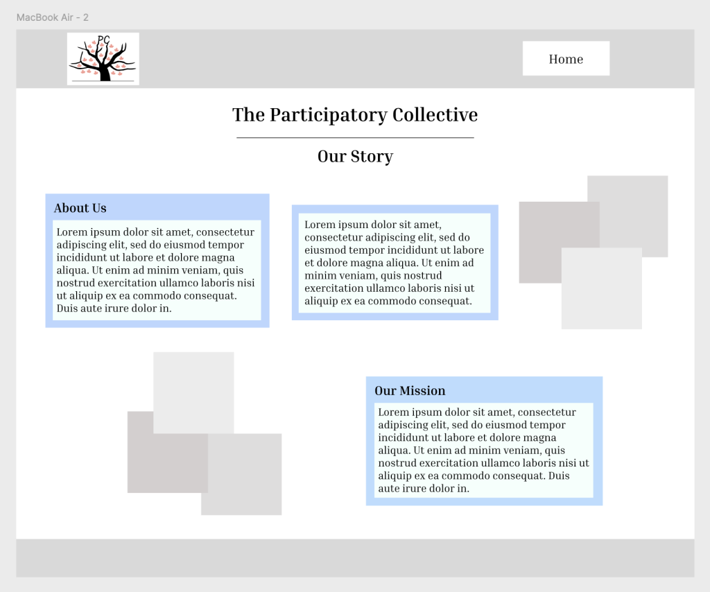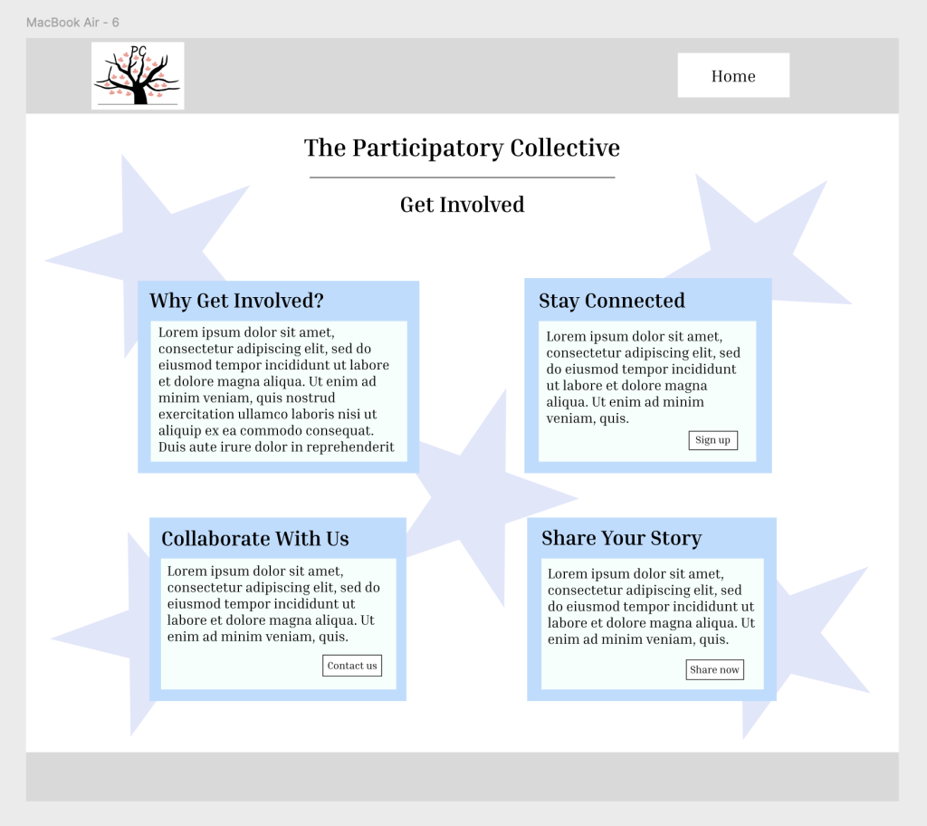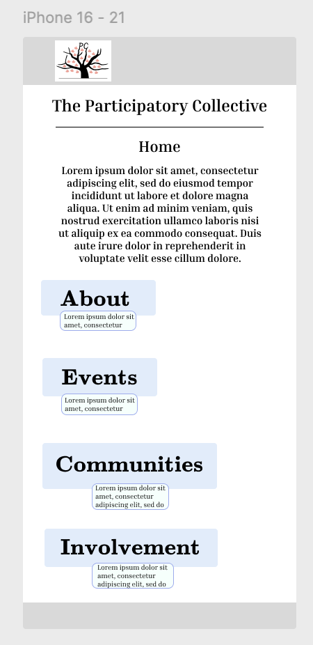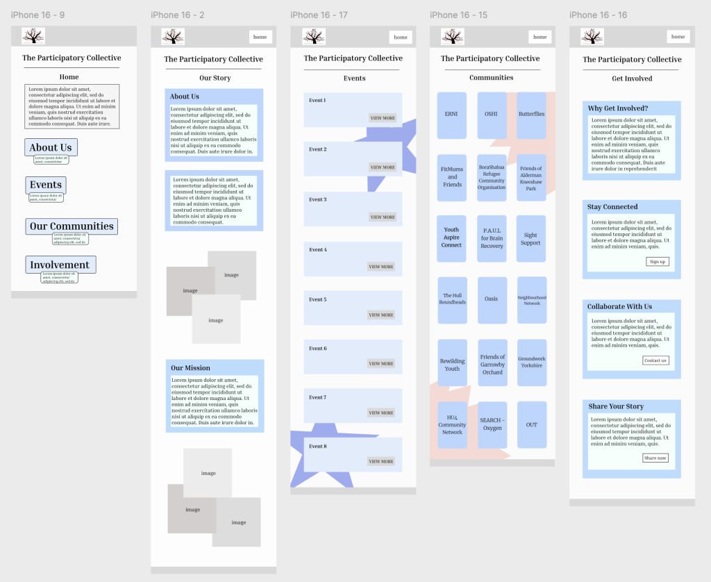 In developing my mid-fidelity prototype, I began shaping a visual direction that feels approachable, calm, and community-focused. Even though mid-fidelity doesn’t focus on final colours and detailed elements, I started defining a visual structure that supports clarity and warmth. I focused on clean spacing, consistent alignment, and simple shapes so that users can scan content without feeling overwhelmed. The limited colour palette used at this stage help highlight navigation. My aim is to create a visual environment that feels friendly and inclusive, reflecting the values of the community groups the website will represent for the Participatory Collective. Essentially, these early visual choices lay the foundation for later refinements in the high-fidelity stage. Throughout the design process, I consistently returned to accessibility as a guiding principle. Many community members may have different digital skills, so I felt the interface needed to be very readable, clearly structured, and supportive. I used large tap areas, uncluttered layouts, and consistent visual symbols to make the mobile experience more forgiving and easier to navigate. I also ensured that sections were broken into manageable blocks, helping reduce confusion. These decisions support a more inclusive experience that welcomes users with varying literacy skills, attention levels, or digital confidence. Designing for a community-centred project also means considering ethical and sustainable practices. I made intentional decisions to keep content concise and reduce unnecessary imagery, which supports faster loading and lower digital energy consumption. Another important part of my design process has been refining the overall visual language of the prototype. Even though this stage focuses on mid-fidelity rather than final designs, I still needed to make early decisions about layout consistency, spacing, and structure. Establishing a simple visual structure at this point helped me understand how information would feel when presented on a small mobile screen, and it allowed me to check whether the navigation and user flow were strong enough and whether they could move through the prototype effortlessly and without hesitation. Additionally, another area I reflected on was how the visual flow of the pages affects the user’s experience. For example, alternating between text blocks, buttons, and section breaks helps prevent any confusion and gives the user natural moments to pause and gather themselves. Even small details, such as keeping elements consistent or ensuring that touch targets are large enough, contribute to a smoother mobile experience. These considerations are especially important for community focused audiences, where users may have varying levels of digital experience. Essentially, by creating a calm, structured layout, I’m aiming to make the design feel approachable and supportive, rather than overwhelming and overly-structured. Lastly, another area I reflected on was the emotional tone conveyed through my design. As the project is based on community stories, shared experiences, and collective values, it felt important that the design did not come across as corporate or detached in any means. Instead, I aimed for a sense of warmth and openness by prioritising clean layouts, gentle spacing, and clear pathways. A welcoming site is essential and my main priority. Even without final colours or imagery, the mid-fidelity prototype still needed to convey and express a sense of this. Ultimately, this helped to guide decisions, such as placing introductions towards the top of key screens, providing straightforward CTA moments, and ensuring that users always know where they are within the flow design.