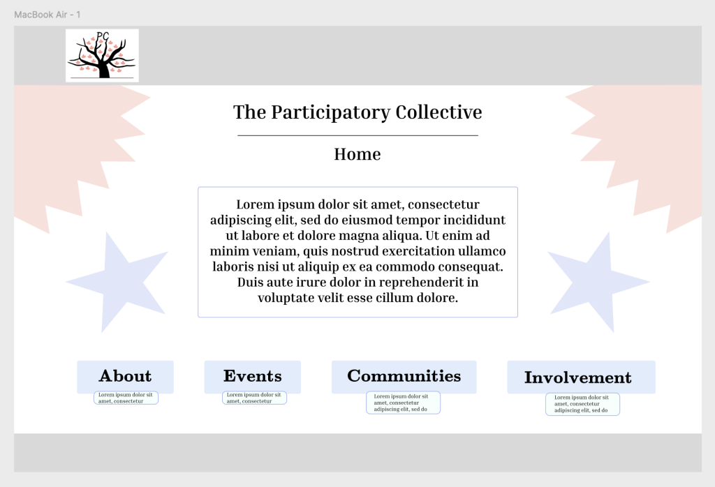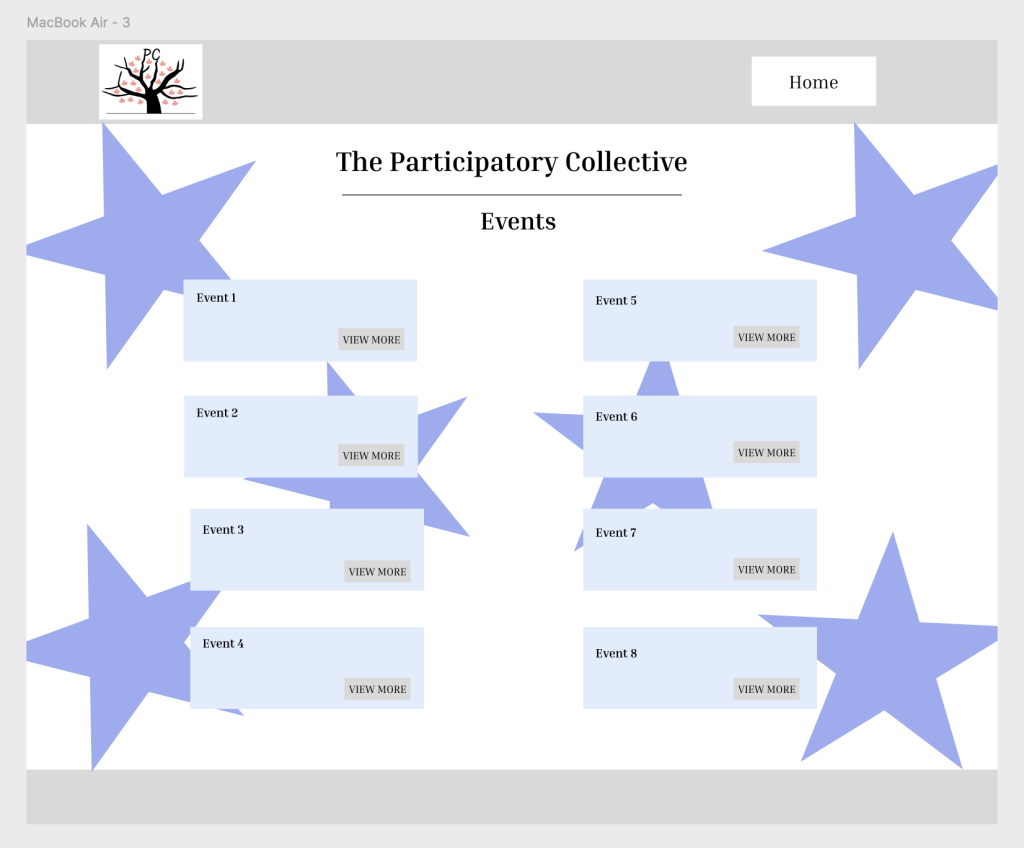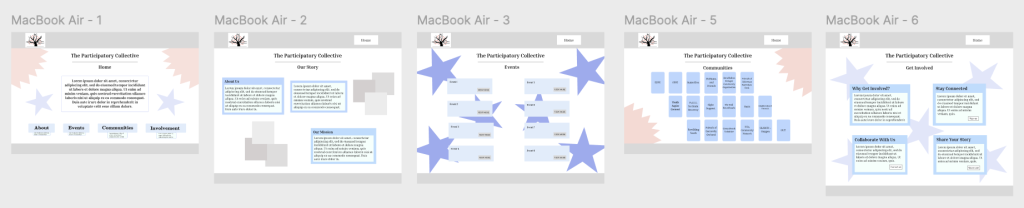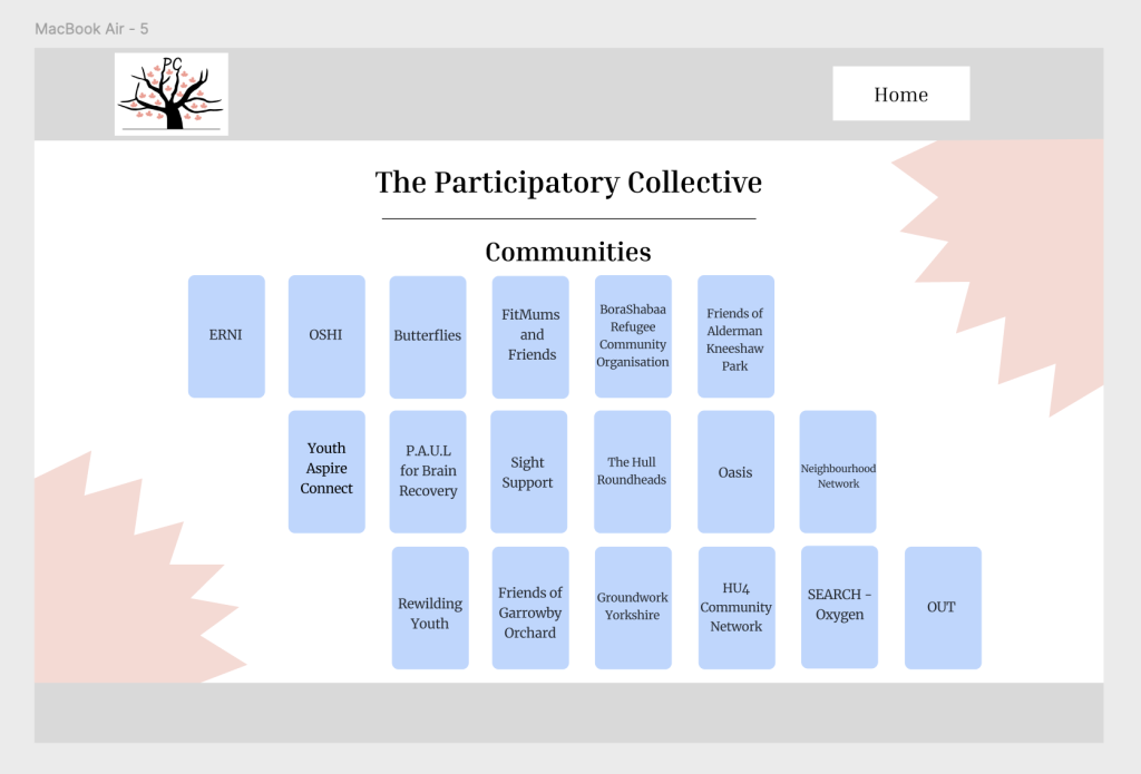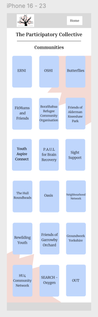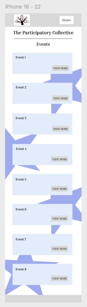 In this version of my design, the navigation is structured as a simple vertical menu, which creates a clear and approachable entry point for users. By placing the ‘Home’, ‘About’, ‘Events’, ‘Communities’, and ‘Involvement’ options in a stacked layout, I believe this makes it easy for visitors to quickly understand the different sections of the site without feeling overwhelmed. The content on each page is arranged in a clean structure, guiding users to scroll naturally down the page to uncover more information. The placement of text blocks followed by images helps the storytelling to have a calm reading flow, which suits a community-focused platform. The ‘Events’ page uses repeated ‘View More’ buttons to create a predictable pattern that makes navigation straightforward, and the ‘Communities’ page is organised into a tidy grid that invites exploration without clutter. I believe these things combined have created clear pathways, for example users can start at Home, learn about the collective, explore specific groups or upcoming events, and finally be encouraged to engage through the Involvement page. Overall, the layout choices support easy movement, minimal confusion, and a clear sense of progression throughout the site.