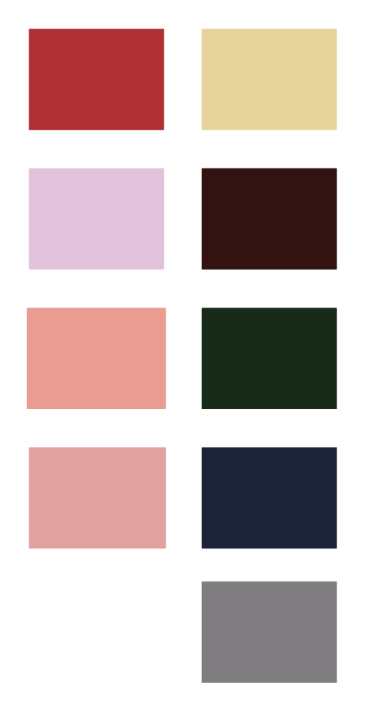 This colour scheme is more rich and grounded, balancing warm reds and soft pinks with deep greens and blues. The lighter tones add warmth and softness, while the darker shades bring depth and sophistication. Overall, it has a mature, elegant feel with strong contrast and visual weight.