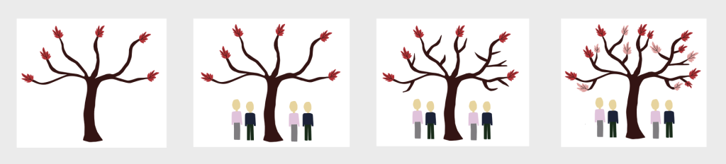 I created this growing tree element to place gradually across the pages to symbolise The Participatory Collective growing, as I felt this would help integrate a storytelling element into my design as this links the sections together. I believe this helps to reinforce the message and give my work a stronger sense of cohesion.