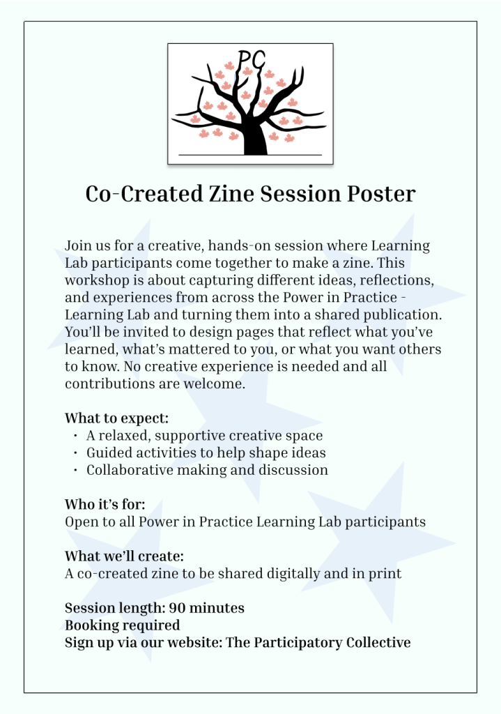I have decided to pick ‘Power in Practice – Learning Lab’ for my event theme, due to its educational aspect and I’m eager to experiment with the ideas for the campaign, such as infographics, session posters, zines, and branded name badges. Moreover, this will be a pop-up space designed to bring community groups, researchers, students, and local residents together by skill-sharing sessions and collaborative workshops. The campaign intends to place the Learning Lab as an accessible, inviting environment, where information is shared from both directions. Essentially, the aim is to raise awareness of the event, underline the Collective’s commitment to shared learning, and influence participation through sign-ups, session attendance, and a collection of things contributed during the learning lab. The core campaign goal is to create an increase in the participation of the Learning Lab.