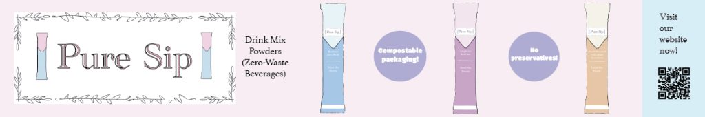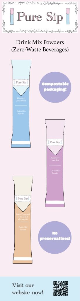 My skyscraper ad reflects the soft, eco-friendly visual identity of the Pure Sip brand through its pastel colour palette, clean layout, and modest illustrations. The hierarchy is clear, with the logo and product name placed at the top to immediately establish the brands recognition, followed by illustrations of some of the products and their key benefits in a circular bubble. There is also a call-to-action (CTA) QR code at the bottom which encourages engagement whilst remaining clear. The balance is created by evenly spacing the products and text, ensuring the design feels organised and easy to read. The text, imagery, and logo placement work well together to communicate the brand’s sustainable message clearly, whilst maintaining clearness amongst the design.