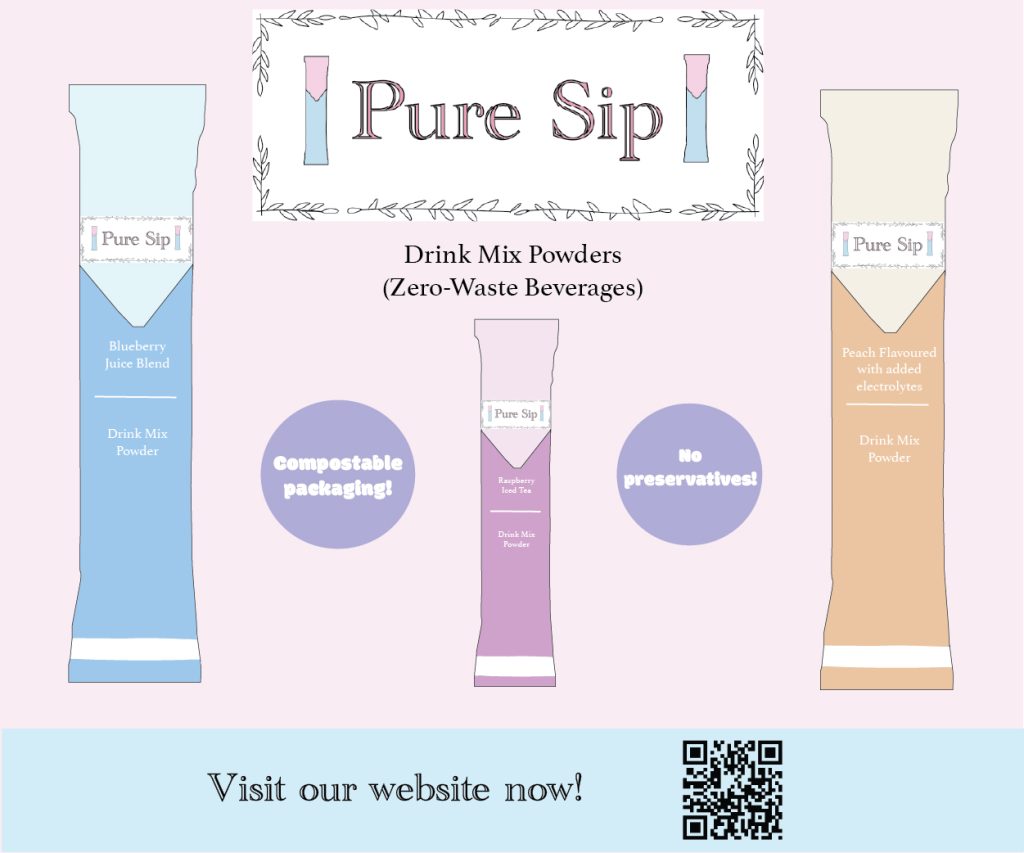 My rectangle ad continues the soft, eco-friendly visual identity of the Pure Sip brand through its pastel colour scheme and clean composition. The logo is placed centrally at the top to create strong brand focus, followed by the product name and visuals to guide the viewer’s eye in a clear hierarchy. The balance is achieved by evenly spacing the three products shown across the layout, with the same circular icons. The CTA QR code is placed at the bottom of the composition. Overall, the layout effectively uses text, imagery, and logo placement to clearly communicate the brand’s sustainable message.